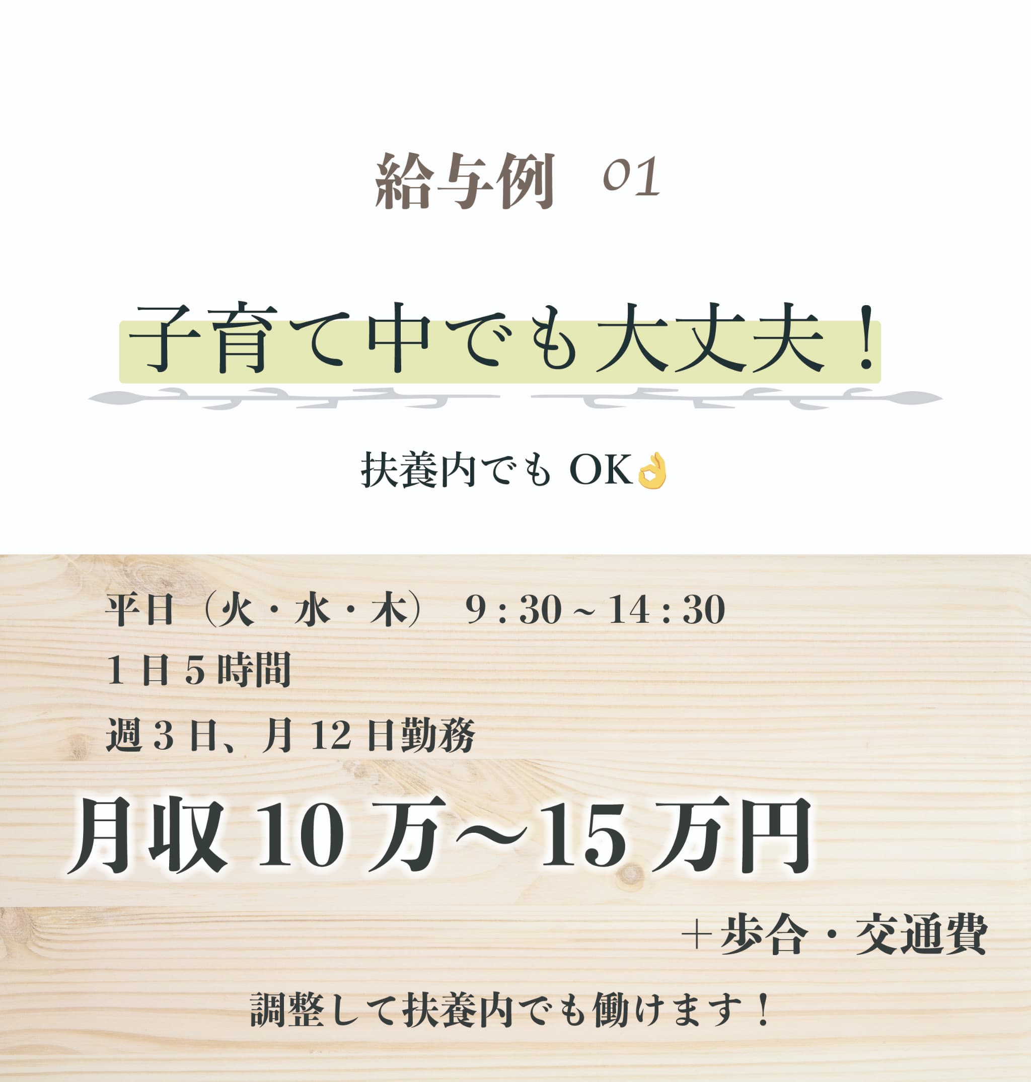 | 勤務時間 | 週3〜6日 1日5h〜 |